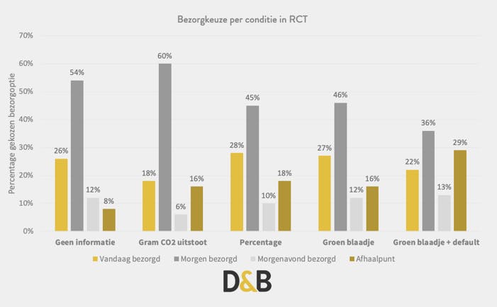Het effect was voor elke informatievariant even groot. Het maakte dus niet uit of de respondent een groen blaadje zag, of het aantal grammen CO2-uitstoot per bezorgoptie.