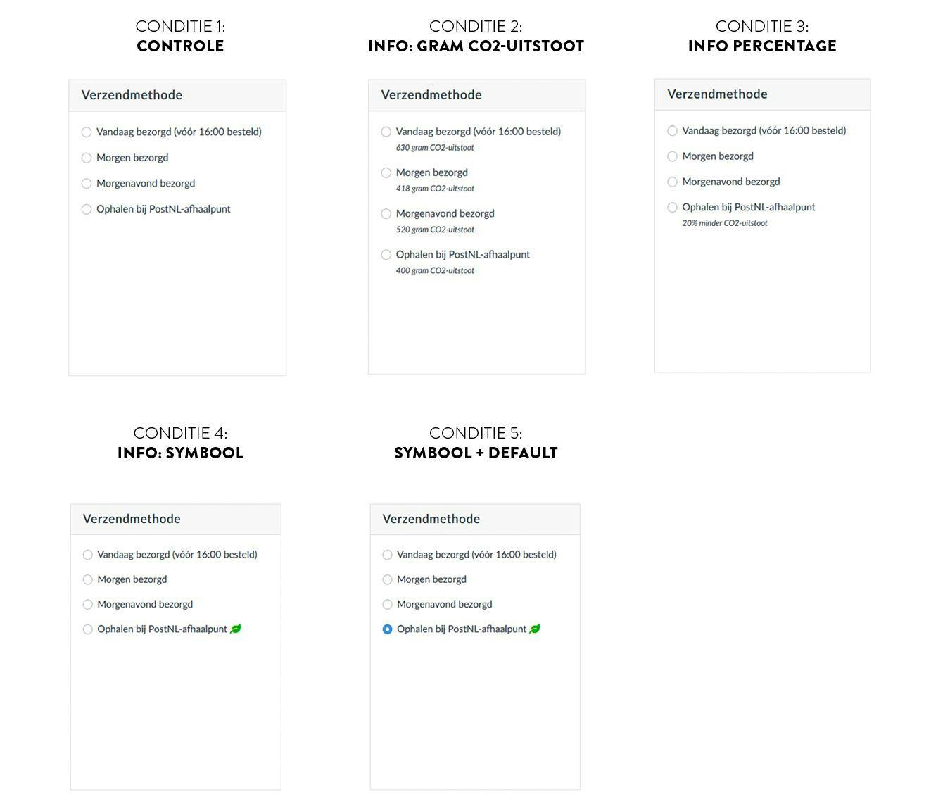 In drie varianten (of experimentele condities, voor de onderzoekers onder ons) gaven we informatie over de CO₂-impact van bezorgopties.