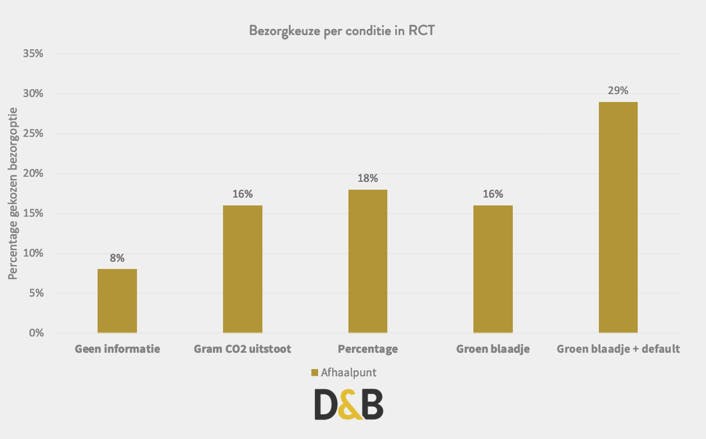 Kennisoverdracht én het toepassen van de default waren beide effectief. Het percentage afhaalpuntkiezers was 16-18% wanneer we (op verschillende manieren) informatie gaven over de CO₂-impact. Dit tegenover 8% wanneer we geen informatie gaven (conditie 1). Een verdubbeling dus!