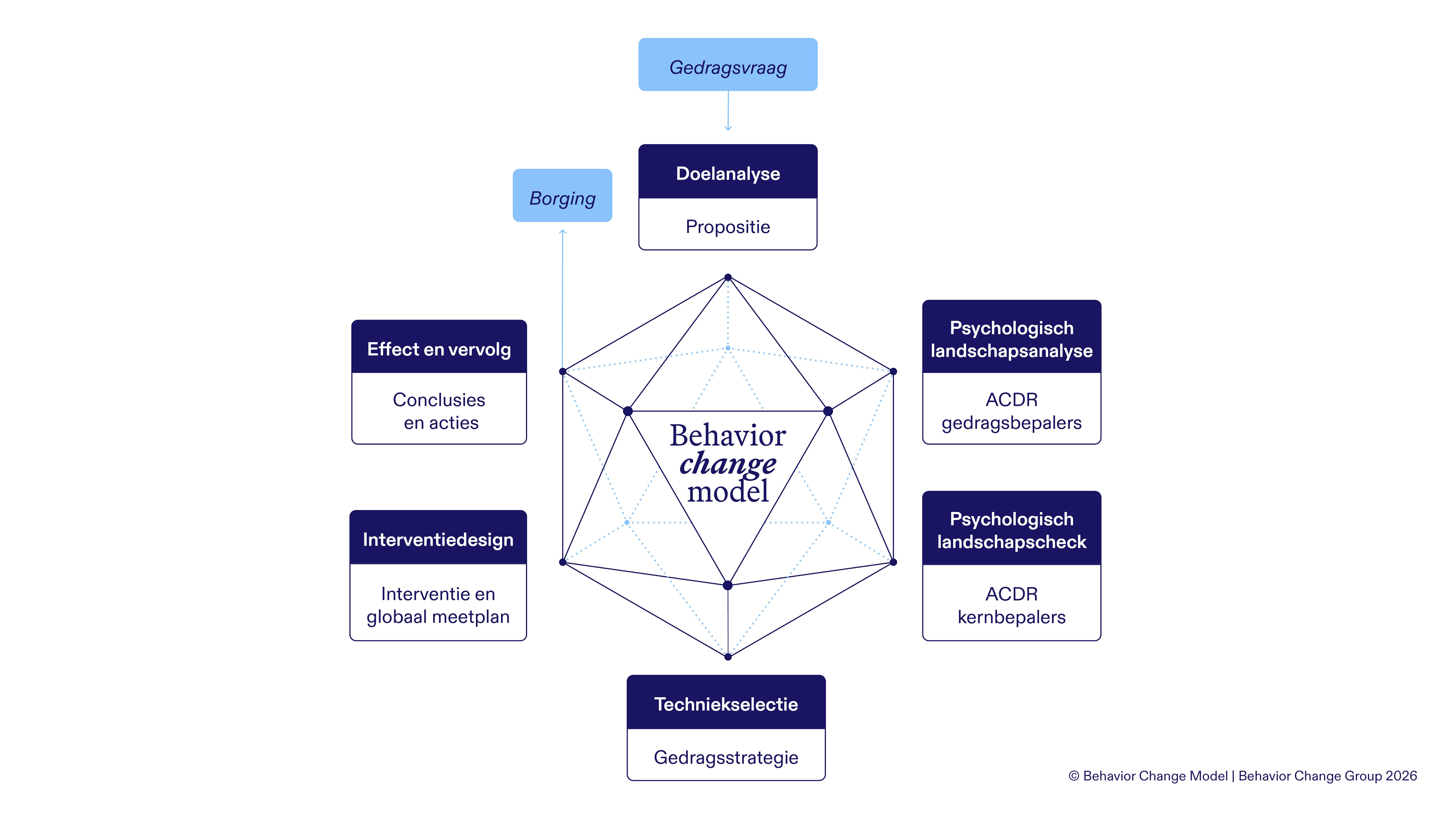 Binnen het Behavior Change Model ontrafel je deze vraag in zes afgebakende fasen. Je analyseert, beïnvloedt en evalueert het gedrag om tot de kern van de oplossing te komen.